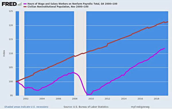 That missing labor factor is evident in the chart below. Since the Q4 2000 peak of the 1990s Tech Boom, the census of potential workers in the US economy has grown by 21%, yet labor hours actually deployed have risen by only 11.9%.