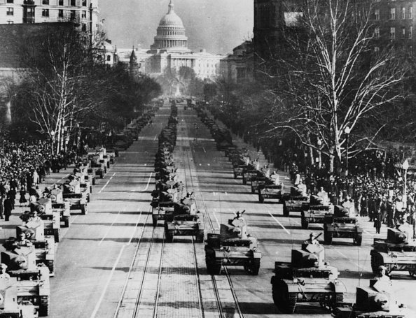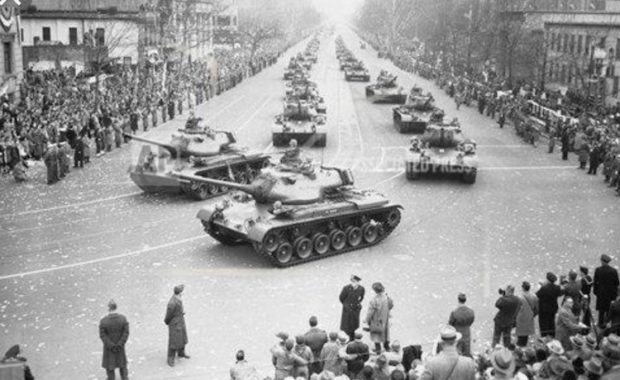 All that’s considered perfectly normal by mainstream America, and liberals are getting their knickers in a knot over a few tanks and “Blue Angels” (another ridiculous yet perfectly normalized American spectacle)? Hell, it’s not even like Trump invented presidential parades full of instruments of mass military slaughter. Check out this photo from JFK’s inaugural parade: