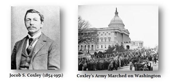 The first march upon Washington emerged at this time from the Panic of 1893 known as Coxley’s Army. This was a group of unemployed men who marched during the depression year of 1894. Jacob S. Coxley (1854-1951) was a businessman in Ohio whose idea was that government should provide employment through creating public works. His ideas were eventually incorporated in Franklin D. Roosevelt’s New Deal and became the WPA in 1935. Coxley set out for Washington on March 25, 1894, with about 100 men and arrived there on May 1st with about 500 more who had joined. Coxley’s First Amendment rights were, of course, violated for they arrested him for walking on the grass and pretended it had nothing to do with his march.