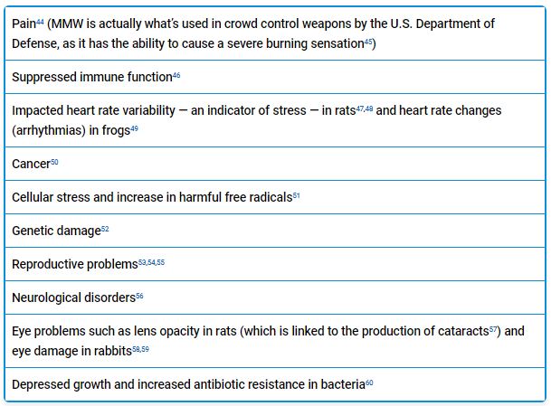 A significant problem with 5G technology is that it relies primarily on the bandwidth of the millimeter wave or MMW, which operates between 30 gigahertz (GHz) and 300GHz.37 The MMW is known to penetrate 1 to 2 millimeters of human tissue38,39 and has been linked to a number of potential health problems, including:40,41,42,43