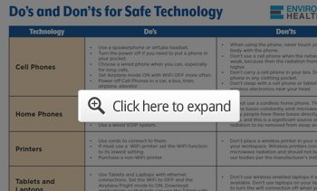 Apart from making your sentiments known to lawmakers, here are several suggestions that will help reduce your EMF exposure and help mitigate damage from unavoidable exposures. For even more do’s and don’ts, see the infographics by the Environmental Health Trust below.
