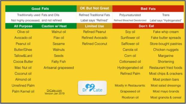 In it, she delves deep into the pros and cons of various fats. The following chart was also created by her, which gives you a quick overview of the good, the bad and the ugly.