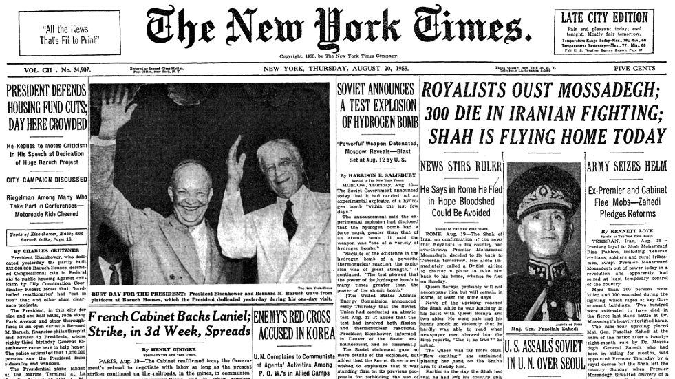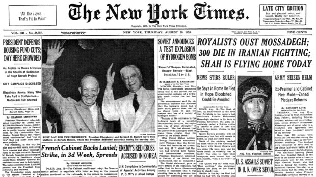 The front page of the New York Times on August 20, 1953. Photo | @OnThisDayNYT