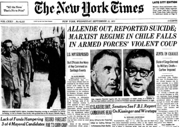 As soon as Allende was elected, the Times began a campaign to demonize the new leader, claiming that Chile’s “free institutions” likely would not survive the “sharp turn to the left” he was proposing. The day after the coup, when Pinochet’s forces bombed the presidential palace and forced Allende to commit suicide, the Times editorial board blamed the President for his own downfall, just as it did with Morales and with Mossadegh, claiming: