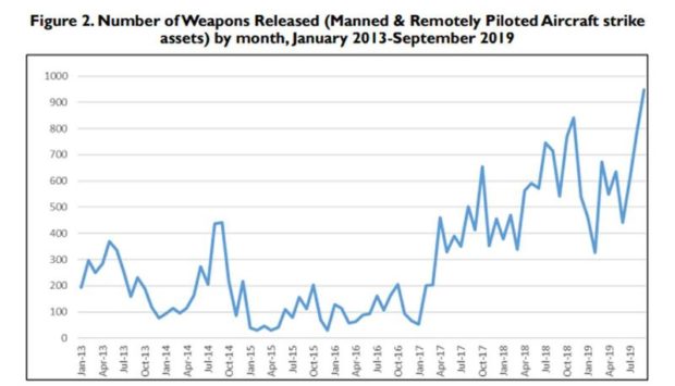 U.S. air operations have escalated considerably under the Trump Administration, as measured by the number of munitions released (see Figure 2). These operations have contributed to a sharp rise in civilian casualties; the U.N. reported that the third quarter of 2019 saw the highest quarterly civilian casualty toll since tracking began in 2009, with over 4,300 civilians killed or injured from July 1 to September 30.