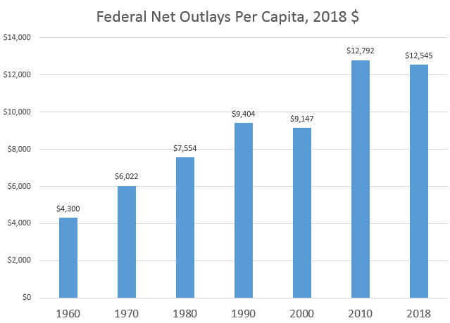 Fueled by huge deficits, federal spending has outpaced tax collections. Per capita federal spending increased by 191 percent from 1960 to 2018, climbing from $4,300 to $12,545.