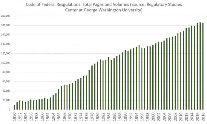 The number of pages published in the Code of Federal Regulations increased 710 percent from 1960 to 2018, and 37 percent over the past twenty years. Every additional page represents new regulations, new rules, new punishments, and new fees. These are costs employers must contend with, and consumers must ultimately pay for. Protectionists who think that manufacturers would flock to the United States were it not not low tariffs might consider the regulatory burden placed on employers by our own domestic policies.