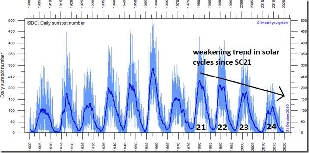 observations of the number of sunspots since 1 January 1900 according to Solar Influences Data Analysis Center (SIDC). The thin blue line indicates the daily sunspot number, while the dark blue line indicates the running annual average. The recent low sunspot activity is clearly reflected in the recent low values for the total solar irradiance. Data source: WDC-SILSO, Royal Observatory of Belgium, Brussels. Last day shown: 31 October 2019. Last diagram update: 1 November 2019. [Courtesy climate4you.com]