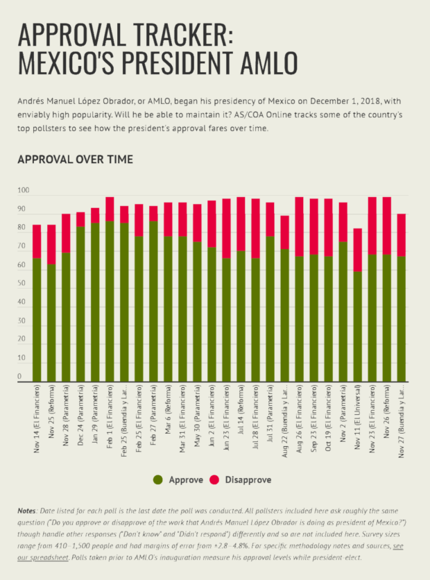 Inequality has fallen, but the country continues to be plagued by drug-related violence. His approval ratings are among the highest of any head of state in the world. He bypasses the traditional, conservative media by putting out a daily conference at 7 a.m. where he speaks directly to the nation. He also immediately sent a jet to rescue Morales after his downfall, offering him asylum in Mexico City.