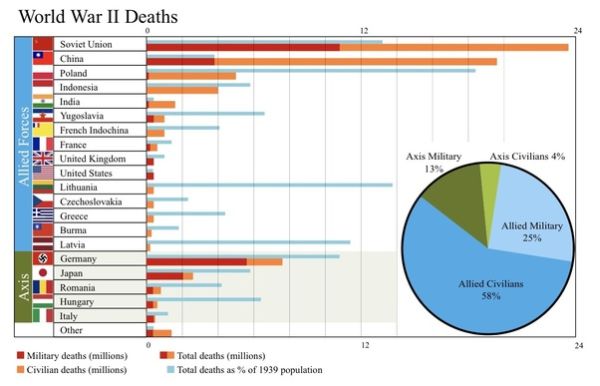 When WWII started and Japan had taken the side of fascism, China contributed its military forces on the side of the Allies. China had the second highest death toll in WWII after the Soviet Union. However, if you look more closely at the graph depicted above, the number of civilian deaths is much higher than military deaths (by about 12 million). This is because the Japanese fascists committed genocide on the Chinese people. The most notorious being the Nanking massacre which not only had a gruesomely large death toll but became infamous for its horrific torture and mass rape on the Chinese people. During this ethnic cleanse by the Japanese fascists throughout the entire WWII (which overlapped the second Sino-Japanese war), mass graves were dug out and millions of Chinese people would be told to step inside before they were shot to death. The Jewish holocaust is recognised as one of the worst crimes against humanity in recent history. However, not much is given to the memory of the mass genocide that was committed on the Chinese people during the same period.