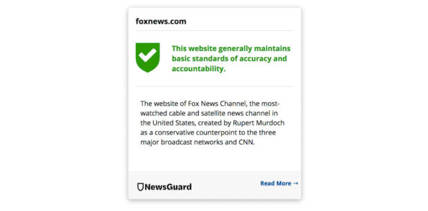 In August 2018, Microsoft rolled out the NewsGuard app, which vets news outlets according to a list of highly subjective standards presented as the site’s “Nutrition Facts,” which include “gathers and presents information responsibly” and “does not repeatedly publish false content,” among some more mundane items.