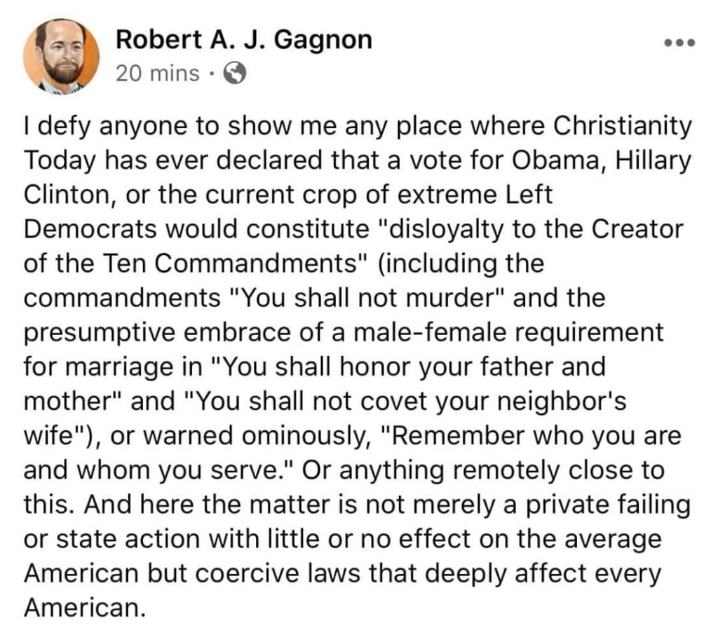 So when CT gets all high and mighty, claiming that their civic slight of hand and clear ideological motivations are “not a matter of partisan loyalties but loyalty to the Creator of the Ten Commandments,” it should be abundantly clear that sanctimony is not purely the business of politico shysters. There is no difference when the Wall Street Journal says that “Those attacking the ‘Deep State’ are really attacking the rule of law” than there is when CT says that resisting “social justice” is unbiblical. In fact, it is these statist straw-men arguments that work in concert to propel forward “progress.”