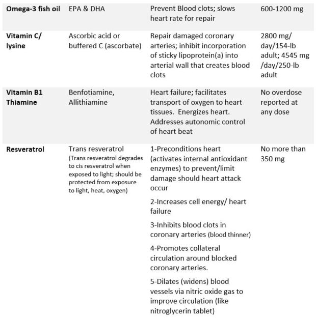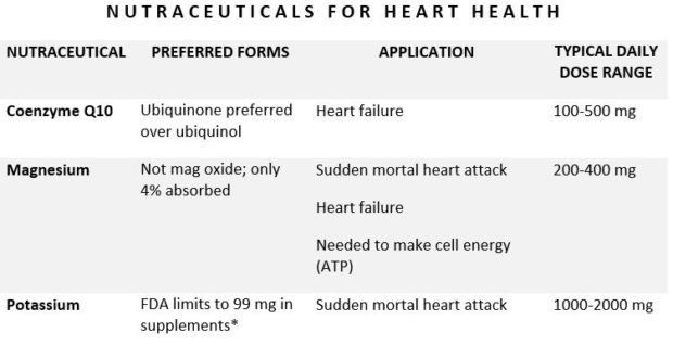 For readers searching for non-drug answers to these issues often have difficulty sorting out priorities and may eventually end up with a grab-bag of dietary supplements because cardiologists are not well-versed in their use. Nutraceuticals like coenzyme Q10, magnesium, vitamin C, fish oil, resveratrol, zinc, thiamine/vitamin B1, garlic, chondroitin sulfate, all may be helpful for different types of heart problems. But when and why to use them?