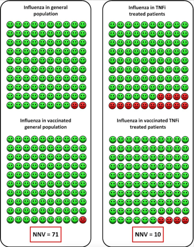 The following chart helps to understand the reduced risk for the flu produced by flu vaccination. The flu shot reduces risk in the healthy population from 2 to 1 in 100. Among individuals who take anti-TNF drugs, 14 will develop influenza and if they are pre-vaccinated prior to starting anti-TNF drugs the risk is reduced from 14 to 4.
