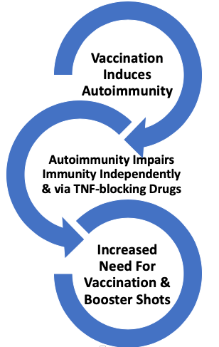 Serious side effects and hospitalization from vaccination may result while the immune response is actually reduced due to use of anti-TNF drugs. This is highly possible because unwary patients may get vaccinated for the flu at local drug stores, bypassing medical risk assessment.
