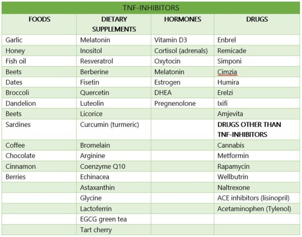 There are natural TNF-inhibitors in foods, dietary supplements and Rx hormones. For example, polyphenols provided naturally from spices, grapes, berries, olives, or as dietary supplements (resveratrol, turmeric/curcumin, catechins/green tea, quercetin) are potent TNF inhibitors.