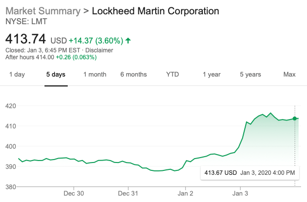 The stock price per share for Lockheed Martin Corp. rose considerably on the announced drone/Hellfire RX9 strike against a target in Iraq on January 3. The price appears to have risen just prior to the announced attack.