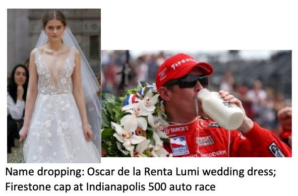 It was like name-dropping the designer of a gown at a celebrity wedding (“and the bride wore a $6000 Oscar De La Renta Luvi wedding dress),” or showing the winner of the Indianapolis 500 auto race on TV wearing an embroidered Firestone cap and shirt emblazoned with sponsors’ names while drinking from a bottle of milk as a reward for his victory.)