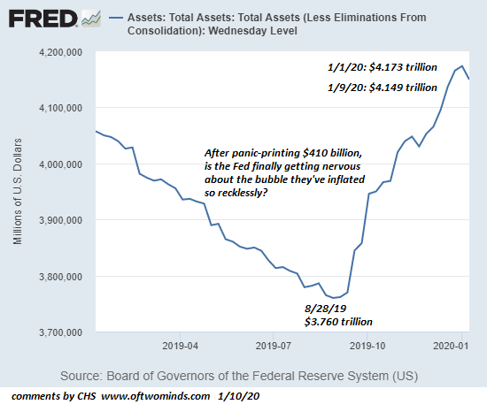Just a friendly heads-up to all the Bulls bowing and murmuring prayers to the Golden Idol of the Federal Reserve: the Fed just slashed its balance sheet–yes, reduced its assets. After panic-printing $410 billion in a few months, a $24 billion decline isn’t much, but it does suggest the Fed might finally be worrying about the reckless, insane bubble it inflated: