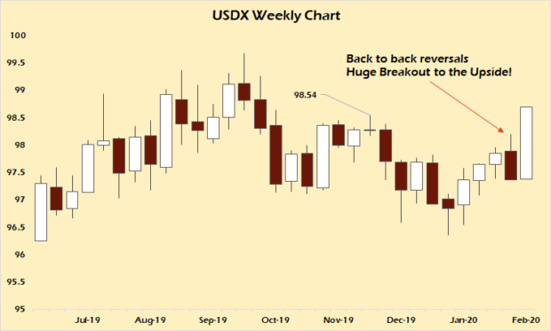 But expect volatility to increase from here. The dollar is strengthening. While the euro narrowly avoided a catastrophic January close last Friday, the dominant bear trend reasserted itself with a vengeance this week, breaking below the all-important $1.10 level.