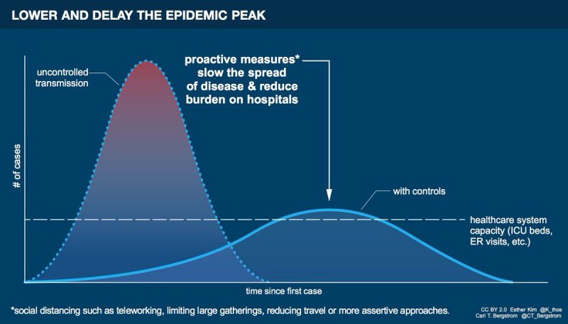 University of Washington biologist Carl T. Bergstrom developed this useful hypothetical graph below (which he specifies is “freely available for any use under the CC-BY-2.0 license”) to get across the idea of how slowing the spread can lessen the chances that your loved one will be turned away by the hospital.