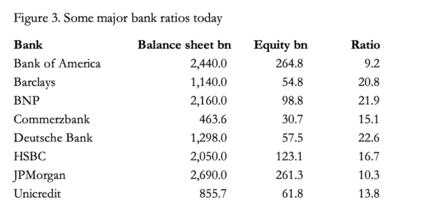 Earlier versions of these controls permitted Fred Goodwin to take the RBS balance sheet gearing to credit hyperspace. They say lessons were learned, but the only lessons learned by the regulators were new ways to keep their eyes shut and ears plugged. Stress testing of bank balance sheets assumes little more than a moderate recession and denies the likely consequences of anything worse. The economic crisis starts with a change in banking cohort groupthink, and not, as regulators with their useless stress tests assume, a decline in GDP, a rise in unemployment, a rise in price inflation, or Heaven forfend, an unexpected financial crisis. And if you think extreme bank leverage would have been controlled following the Fred Goodwin episode, think again. Figure 3 shows current balance sheet to equity ratios for a selection of major banks. Through the magic of modern accounting practice, they are almost certainly higher than reported.