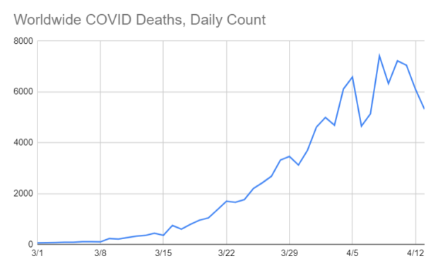 New cases of disease are the leading trend indicator, but infection counts are hard to come by, because the great majority of people with mild cases are not being counted, and testing is limited in both accuracy and availability. So we make a mental note that deaths (plotted above) are 2 to 3 weeks behind the infection rate. New infections probably peaked 3 weeks ago.