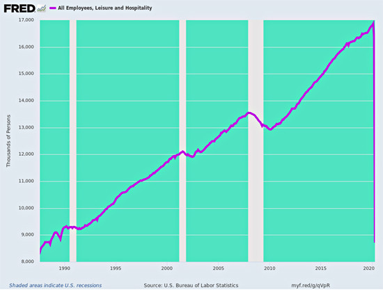 Moreover, it’s not as if the leisure and hospitality sector is some marginal back-street of the US economy. Just 60 days ago some 17 million workers were pulling paychecks from the tens of millions of firms and establishments which comprise the sector.