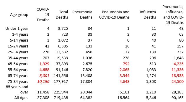 The first statistic is that during this period 719,438 Americans died from all causes. So in a population of more than 328,000,000 roughly 0.02 percent of Americans died. Our population is increasing because the birth rate is greater than the death rate. During this period 37,308 Americans died from Covid-19. Every diagnosis has something called and ICD-10 code (International Classification of Disease version 10) and the Covid-19 code is U07.1. In the United States only a licensed Allopathic Physician (M.D. or D.O.) can diagnose; it is the right granted to their cartel by the government. It is worth noting there is yet a second column of pneumonia deaths that also have Covid-19. Pneumonia is an infection in one or both lungs. Bacteria, viruses, and fungi cause it. The infection causes inflammation in the air sacs in your lungs, which are called alveoli. The alveoli fill with fluid or pus, making it difficult to breathe. It is not clear if the pneumonia co-morbidity with Covid-19 is added to or is part of the 37,308. However, it is clear that pneumonia deaths during this period or much greater than Covid-19 some 64,382. Where is the concern for the national pneumonia nightmare, it is clearly greater?