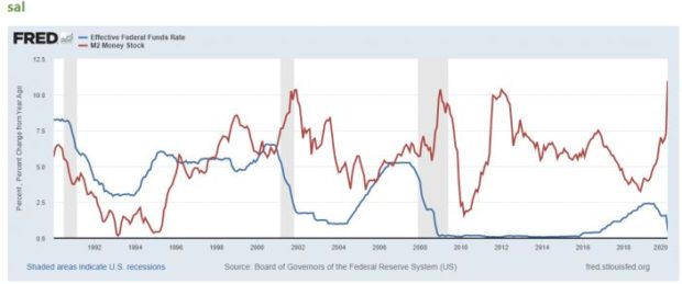 In this passage, Tamny’s misrepresentation of ABCT is on full display. First, neither Thornton nor any other Austrian economist, past or present, has ever proposed that the Fed lowers interest rates “merely by decreeing ‘cheap credit.’” The fact that Tamny maintains this indicates that he is innocent of any knowledge of the crucial role of money and credit expansion in ABCT. As pointed out above in the quotation from Mises, what engenders the boom and perpetuates it is the injection of fiduciary media into credit markets regardless of the movements of interest rates, especially short rates. As I have argued elsewhere, a higher (lower) growth rate of the money supply is perfectly consistent with increases (decreases) in the fed funds rate. This is illustrated in the graph, which over the period 1990-2020 displays no systematic relationship between the monetary growth rate and the fed funds rate.