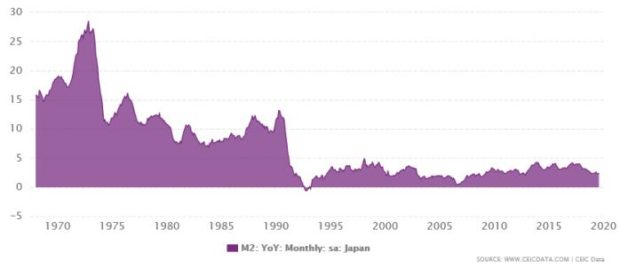 Tamny’s failure to grasp the essence of ABCT is starkly revealed by his contention that the Nikkei Index is still below its 1989 peak despite the fact that the BOJ has maintained its targeted interest rate near zero since the 1990s. As the graph below shows, the average year-over-year growth rate of the Japanese monetary aggregate M2 in the 1980s was more than twice as high as it was from 1990 to 2020. For Austrians it is the money supply and not manipulations of a short-term interest rate that affects asset prices.