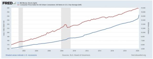 In fact, this is precisely what has been occurring in the US economy over the past three decades. As the graph below shows, from 1990 to 2020, the Fed appeared to “aggressively print money,” increasing the M2 aggregate from $4.653 trillion to $16.871 trillion or by 270 percent. This near quadrupling of the money supply resulted in a continually depreciating dollar, as the price level as measured by the headline CPI index more than doubled and the dollar in 2020 retained only $.49 of purchasing power compared to the 1990 dollar. And yet, contrary to Tamny’s assertion, there continue to be “takers” for the depreciating US dollar, as the advance estimate of last quarter’s (annualized) GDP of $21.51 trillion—albeit forcibly shrunken by government restrictions of economic activity—can readily attest.