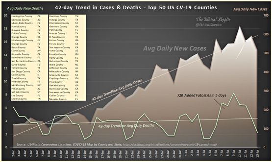 But, alas, the death count trend in these 50 counties has not risen at all – except for the last few days when a lot of “catch-up” data for earlier fatalities was thrown into the data hoppers by some of the counties involved.