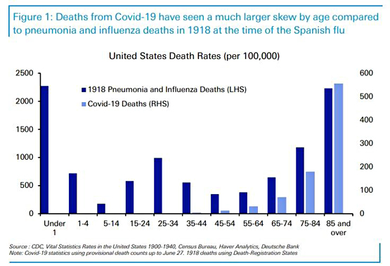 In fact, the impact of the Spanish Flu was not only 17X greater in terms of the overall mortality rate, but it was also a true Grim Reaper in the sense that it struck across the entire age spectrum of the population (dark blue bars).