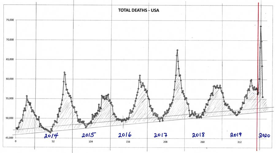 A sharp peak like this has never been seen this late in the season before, and it’s happening [synchronistically] everywhere, on every continent, at the same time in direct immediacy after the declaration of the pandemic. To my eye, there is no doubt that there was an acceleration of deaths of vulnerable people due to government responses …