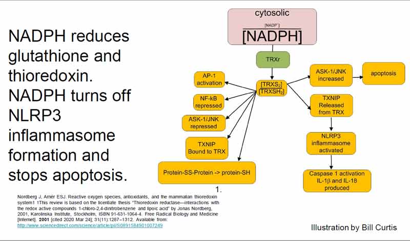 NADPH also turns off NLRP3 inflammasome that produces cytokines like TNF alpha, NF Kappa B, IL1B, IL6 and IL18 (interleukins) that are causing all the damage.