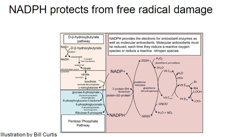 NADPH is the battery of your cell, the reservoir of electrons that actually cause endogenous antioxidants like glutathione, vitamin E and C to be recharged so they can continue to work and mitigate against the free radical damage resulting from all this oxidative stress. One way to compensate is to make sure you have enough NADPH, and ketones radically upregulate NADPH.