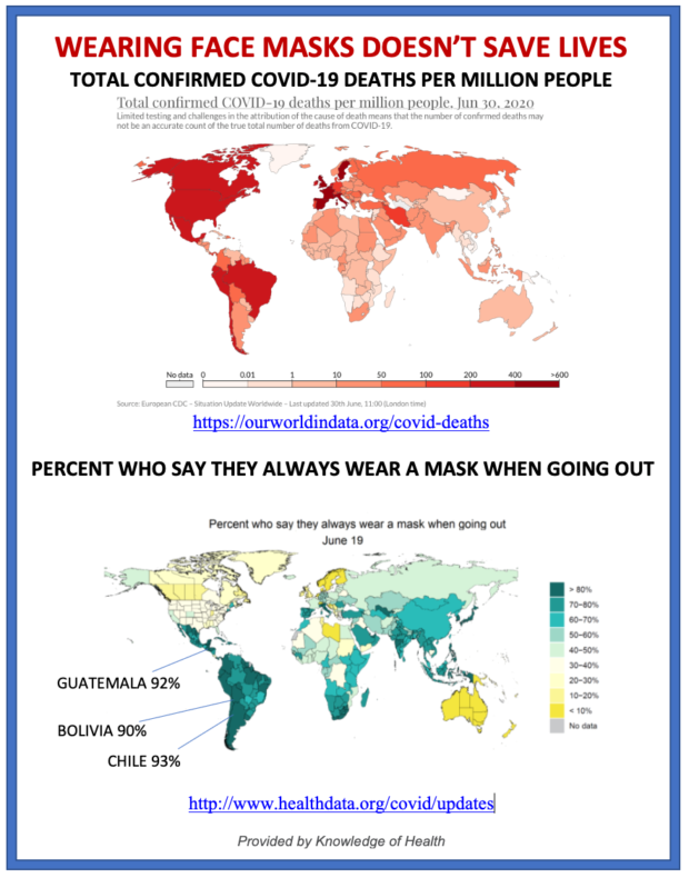 Do not listen to the health experts (imposters). Maps of countries where face masks are worn almost religiously, like Bolivia and Chile in South America, reveal these countries have high death rates from COVID-19 coronavirus.