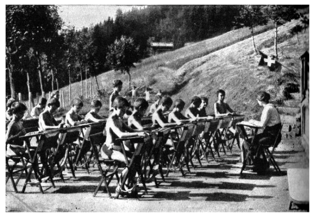 Young bare-chested male students schooled outdoors in midday sun (circa 1940s) to prevent tuberculosis; no vaccine needed.