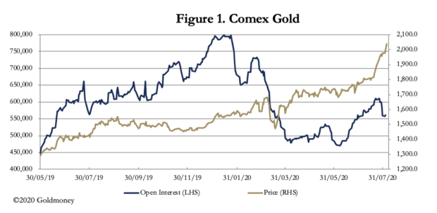There is no question it was a coordinated attempt by the bullion bank establishment to contain a developing crisis. From its peak of 799,541 contracts on 15 January open interest fell to 553,030 on 23 March. Initially, the gold price continued rising to $1680 on 9 March, but by 18 March it finally reacted, falling to $1471 in only nine trading sessions. But while open interest went on to fall to 470,000 in early-June, the price exploded higher with unprecedented price premiums developing on Comex from 23 March onwards. The bullion banks’ short exposure net of longs on Comex in a rising market had risen to $35bn and the gross position was $53.5bn before the attempt to drive the market lower. Today, the respective figures are $38.3 and $53bn.