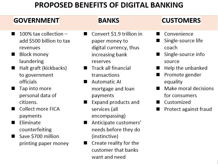 Bank depositors will benefit from a digital money card, but only in small ways. Glen Frost, Founder; FinTech Summit & FinTech Awards explains that FinTechs typically offer “better user experience, cheaper prices and a dedicated focus on solving a specific problem.” But these small savings won’t elevate any American’s income bracket by any measure. The benefits to consumers from the digital neo-dollar will be marginal. Bankers’ objective is to make everyone a debt slave.