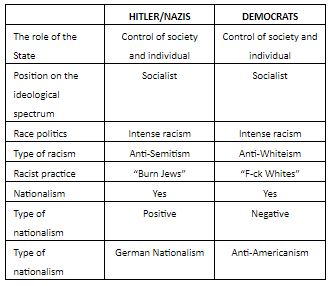 Being Hitler’s kindred, it is no surprise that Democrats’ works result in ruin and destruction. As Hitler ruined Germany, so will Democrats ruin America if they ever manage to gain power. It should be the hope of all good and patriotic American that this never happens. As a warning and as instruction to those who still do not see the Democrats’ real nature, we present a table of similarities.