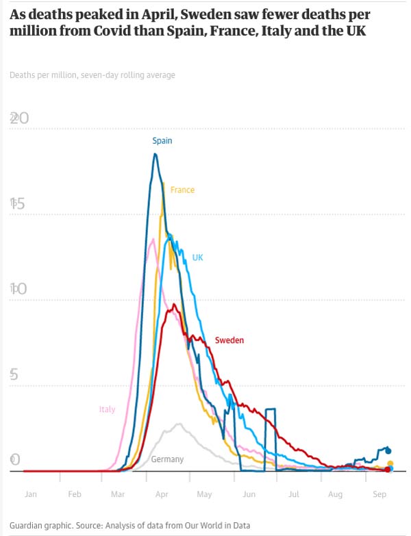 The two graphs from The Guardian,36 below, show Sweden’s infection rate and deaths per million, compared to other countries that enforced stricter lockdown rules.