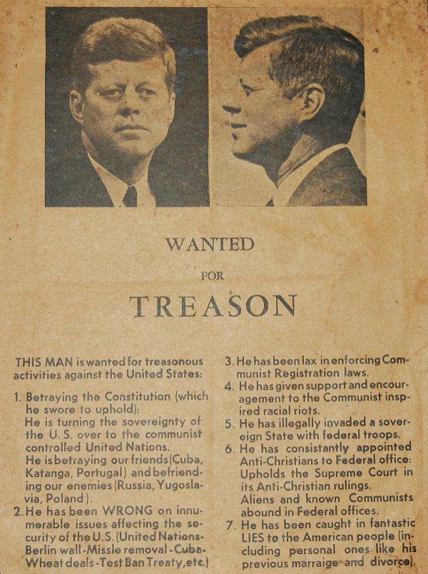 President Kennedy was assassinated in Dallas, Texas on Nov. 22nd, 1963. Two days before his assassination a hate-Kennedy handbill (see picture) was circulated in Dallas accusing the president of treasonous activities including being a communist sympathizer.