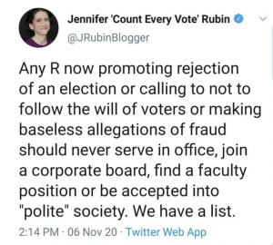 It’s self-evident, you see. The charismatic Joe Biden is moving into the White House, pets and all (plus Hunter in the Lincoln bedroom). Done and done, signed, sealed, delivered according to us, the august Newspaper of Record! Don’t even bother complaining, ye pathetic hordes of racist, red-hatted whiners…. And, by the way, we’ll be coming after all y’all not so fine people — as signaled by Washington Post op-edster Jennifer Rubin: