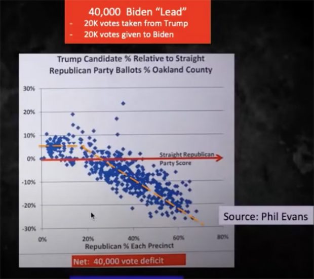 I guess we’ll find out what can be proven, and that is all the president is attempting to do, like anybody with faith in the scientific method. In Oakland County, Michigan, for instance, comprising the northwest suburbs and exurbs of Detroit, the graph shows a mysterious bending of votes off a trend-line at a pretty clear break-point. Each blue square is a voter precinct.
