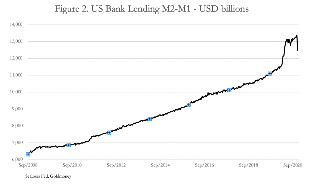 Apart from the decrease of deposits in M2 and the increase of funds in checking accounts, the origin for most of the sudden fall in US M2 money supply in November is linked to the contraction in bank lending. Figure 2 is of M2 minus M1, giving an approximation from customer deposits of the course of bank credit on the other side of bank balance sheets.