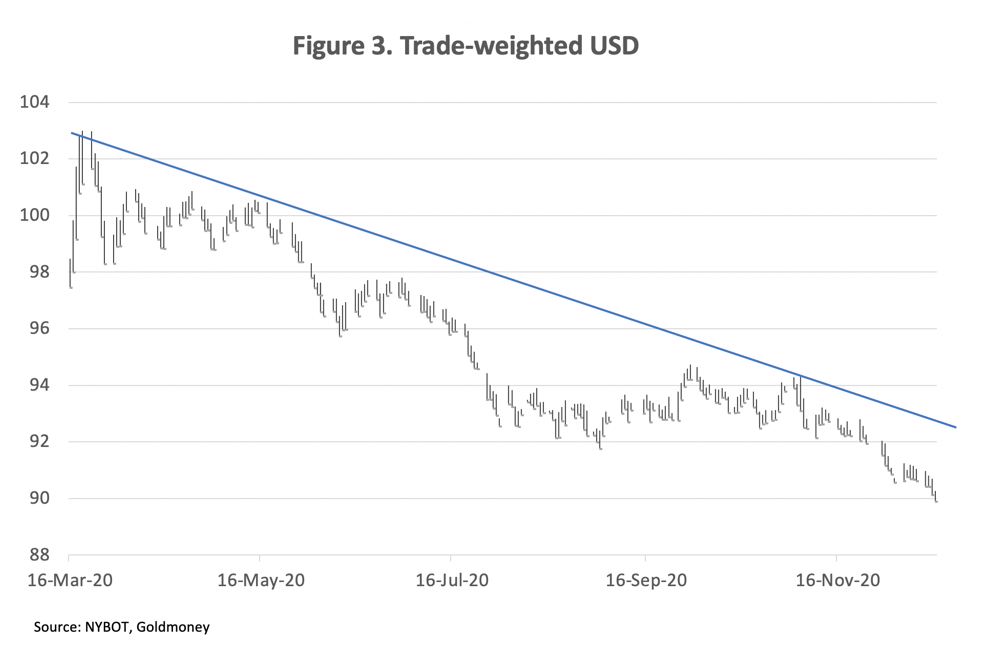 So far, the Fed has been acting conventionally in Keynesian terms to rescue the US economy. In order to ensure that the consequences of covid are contained, it has promised unlimited QE, currently running at $120bn a month, to fund the increase in the Federal budget deficit. They have imposed zero interest rates to keep funding costs down. The initial round of monetary inflation financed two-thirds of increased federal spending in the second half of fiscal 2020 to end-September, the remaining third being from revenues. A second “stimulus package” is due shortly, which will be financed by yet more monetary inflation.