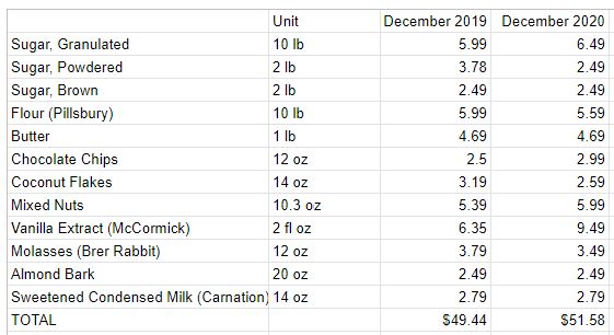 This involves the annual trip to the grocery store for baking supplies, a kind of bizarre kickoff event that has become a personal tradition (imagine a cart overflowing with sugars, chocolates, and the like). It has occurred to me on more than one occasion that the supplies are becoming more and more expensive, but it was always a sticker shock reaction without any data to support it.