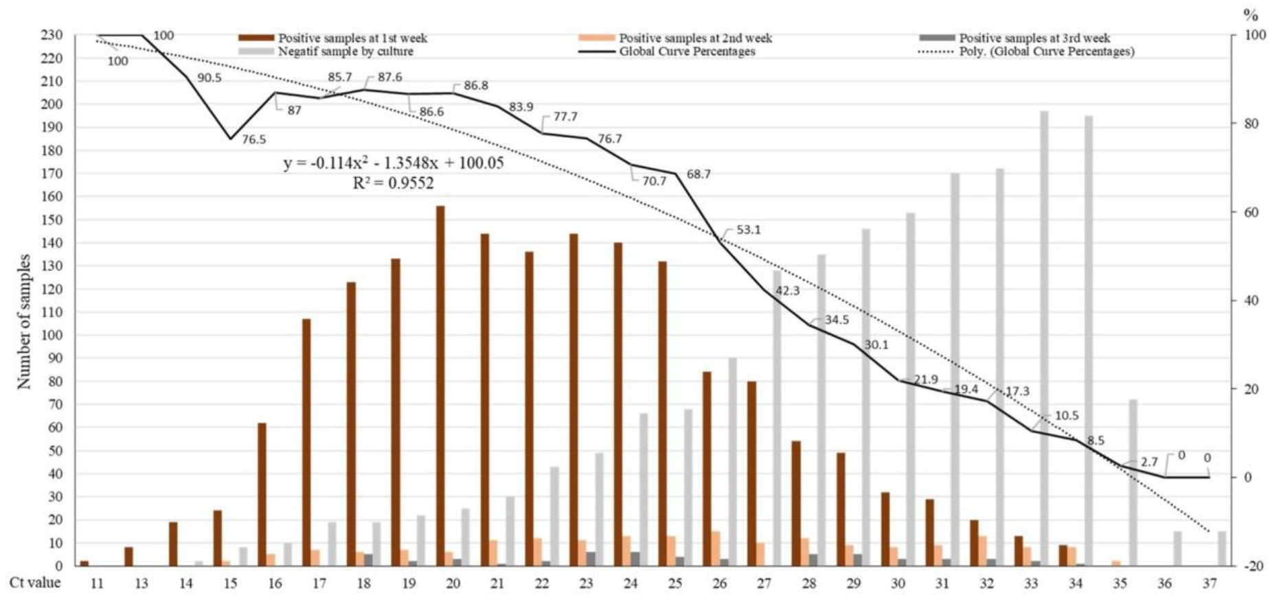PCR cycle threshold (11-37) and positive cell culture (black line, 100% to 0%). The colored bars indicate the number of positive cell cultures per Ct per week after infection (1 to 3 weeks). (Jafaar/Raoult)